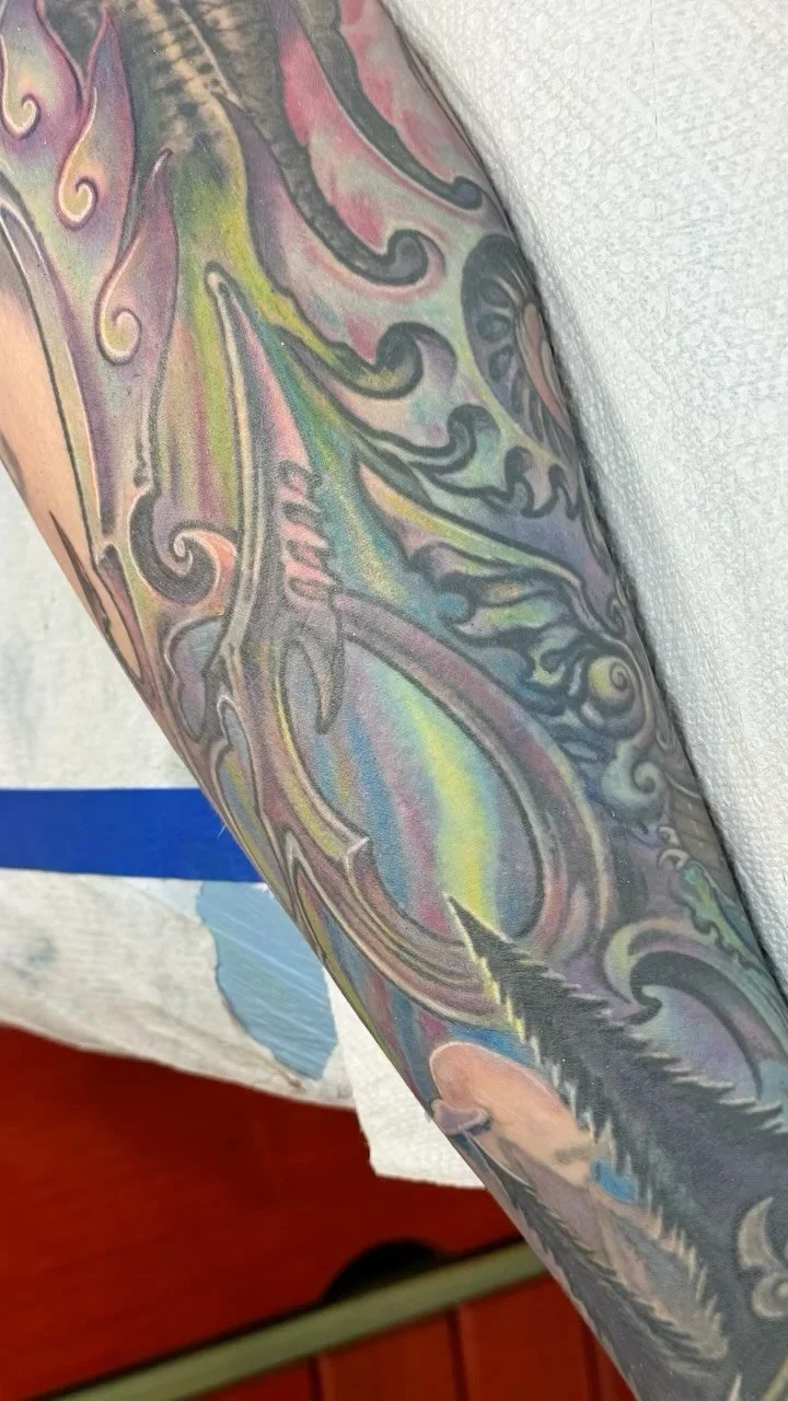 How I approach tattooing is similar to painting. Revisiting, developing, and defining through multiple sessions allows me to build the tattoo in layers and fine-tune the composition. Both processes rely on gradual refinement and responding to what's needed.