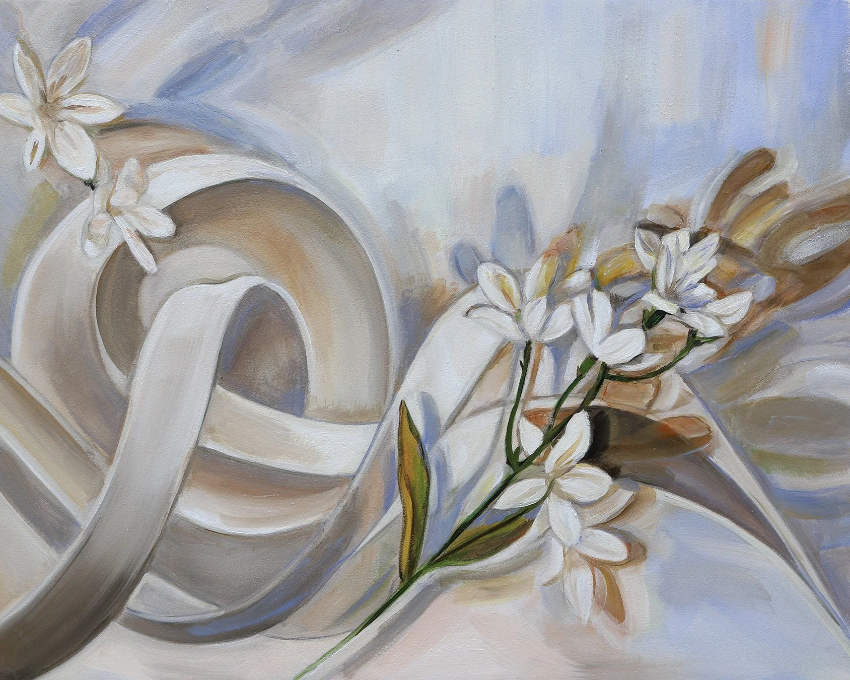 I create compositional rhythms, often combining flowers and nature-inspired imagery mixed with geometric shapes and atmospheric space. I consider my process to be an Active Meditation. My paintings are inspired by nature and the comingling of abstract elements and movement between layers. Each piece begins with observation and evolves into a more internal exploration.